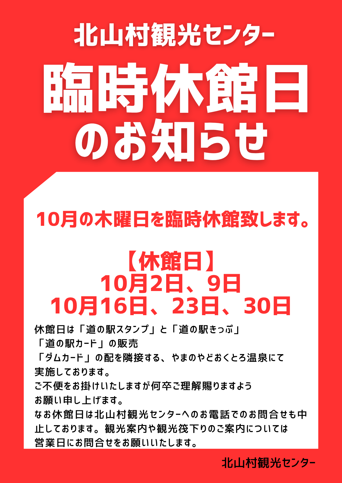 〇北山村観光センター 臨時休館日のお知らせ〇
