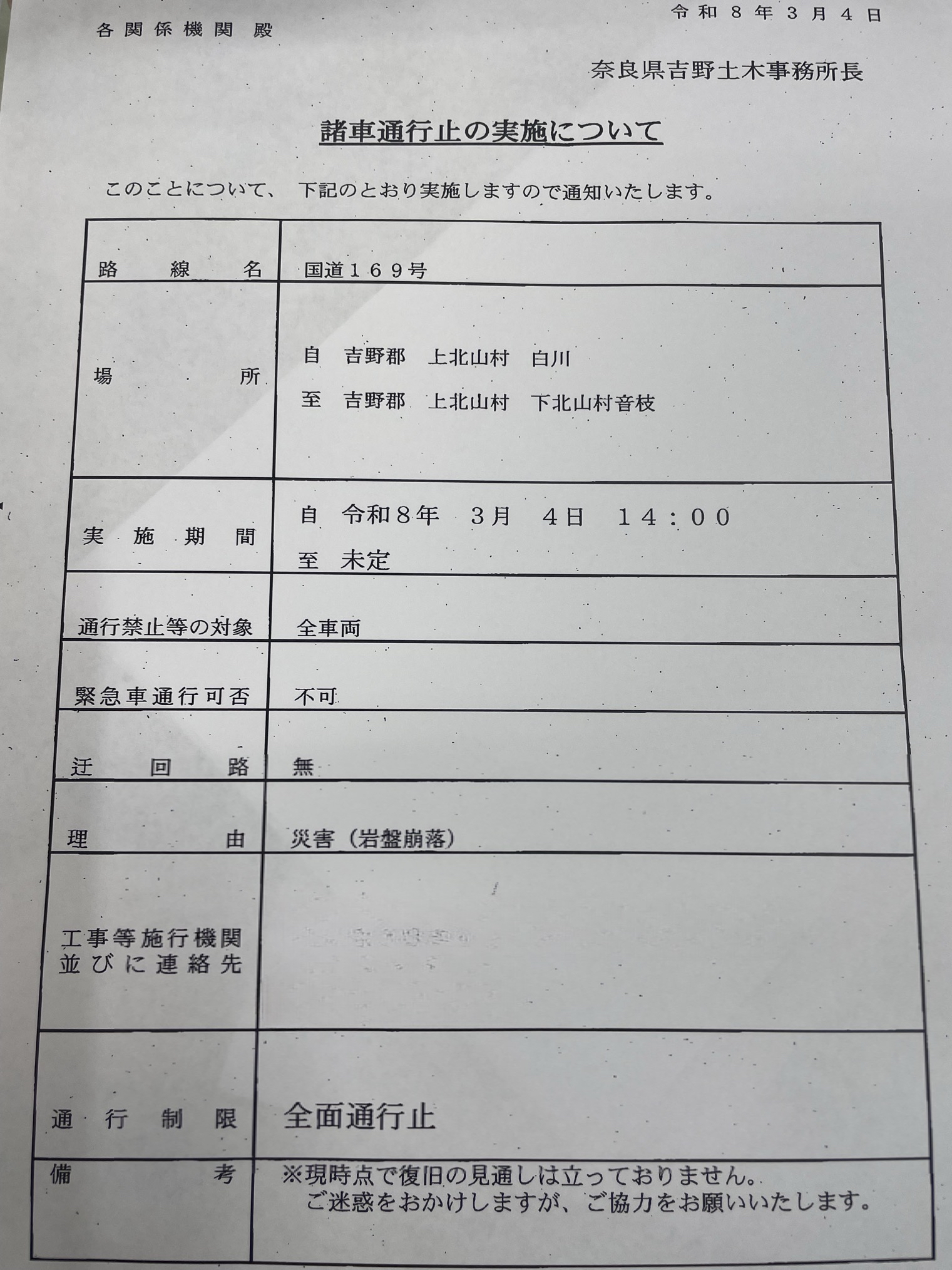 国道169号線 奈良県下北山村にて令和8年3月4日14時より岩盤崩落のため全面通行止めとなっております。